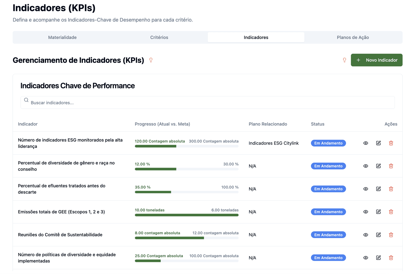 Desdobramos os temas materiais da sua empresa em planos de ação detalhados, com metas SMART (específicas, mensuráveis, alcançáveis, relevantes e temporais) e indicadores de desempenho (KPIs) alinhados a frameworks globais, como GRI Standards, SASB e ODS da ONU.